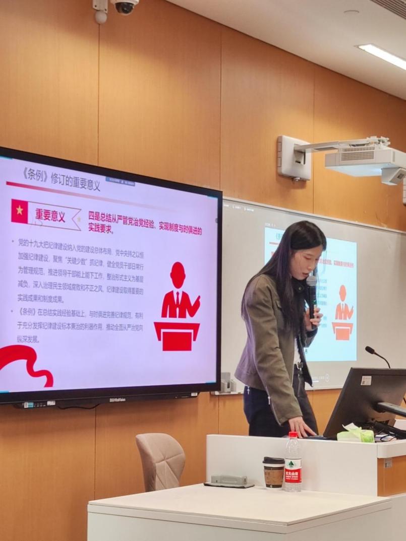 支部委员陶雨然对最新修订的《中国共产党纪律处分条例》(以下简称《条例》)进行了详细解读。新修订的《条例》强调了全面从严治党的必要性,以及维护党章和其他党内法规的严肃性。讲解中特别提到,《条例》的修订是为了加强党的自我监督,确保党员、干部严守党的纪律,保障党的纪律的刚性和严肃性。她还详细讲解了《条例》的主要内容,包括纪律处分的种类、适用范围和执行原则,以及如何通过“四种形态”精准实施纪律审查等。