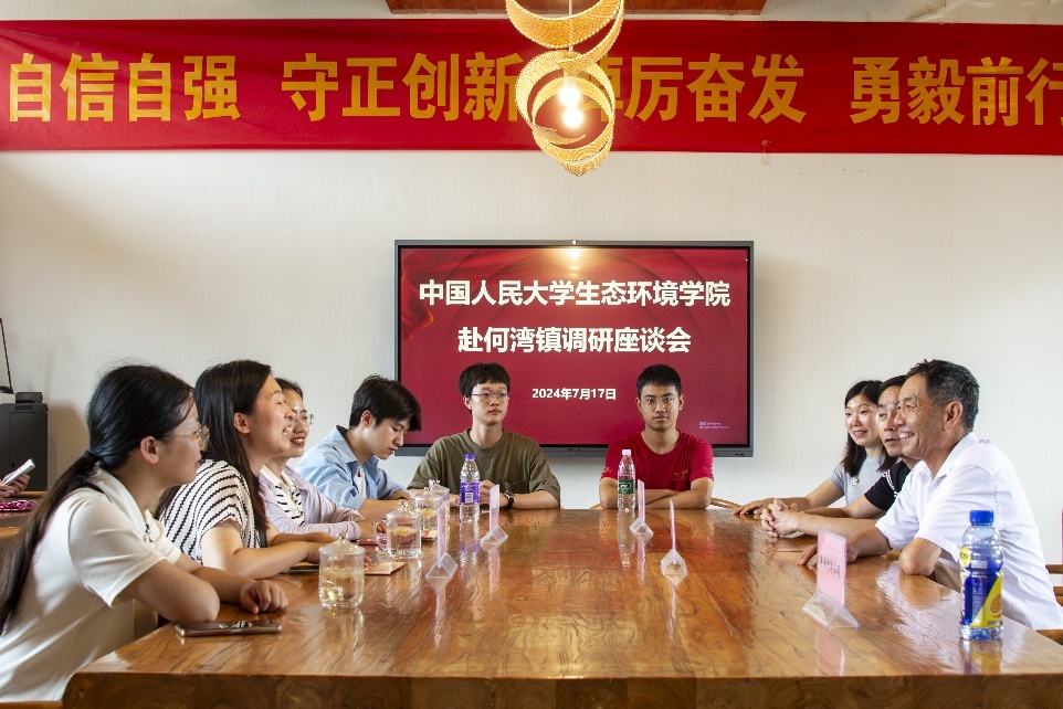 In the afternoon, School of Ecology & Environment at Renmin University, in collaboration with the Environmental and Economic Policy Research Center of the Ministry of Ecology and Environment, and the Yandun Town Government, held a discussion on the practical innovation of the "Two Mountains" concept. The research team gained valuable insights into Aili Village's significant measures and achievements in implementing the "Two Mountains" concept, praising the local efforts to create the "Mountain Water Original Home · Love Aili" themed rural tourism brand while preserving the original appearance of the countryside. The team was particularly impressed by Deputy Mayor Ruiting Tao's fluent responses to student inquiries and her thorough understanding of the town's development data, representing grassroots leaders' dedication to promoting the flourishing development of Yandun's ecological cultural tourism industry. The team then conducted household surveys to further investigate local development conditions, business models, and villagers' experiences.