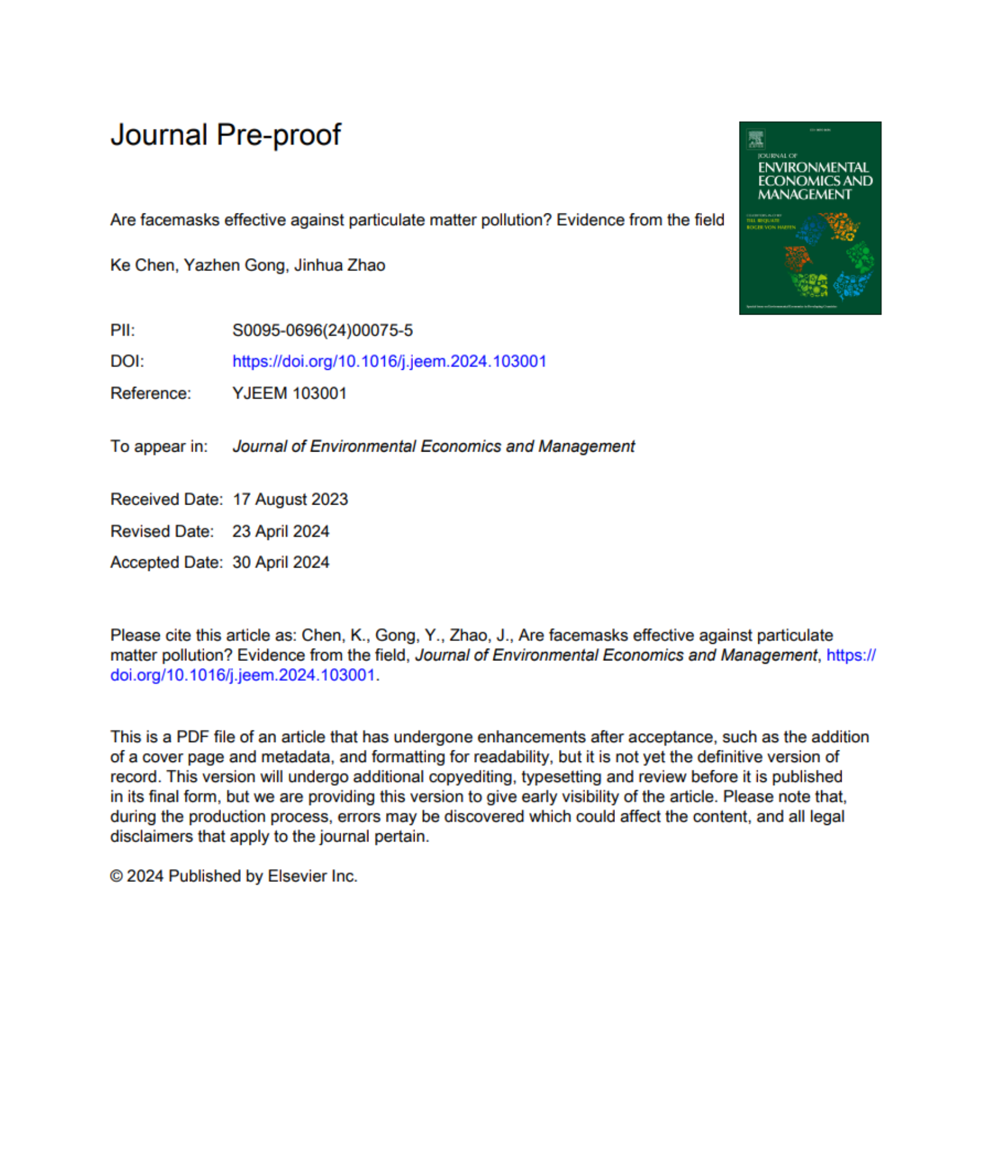 Yazhen Gong et al:Are facemasks effective against particulate matter pollution? Evidence from the field