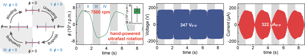 这项研究受到许多人小时候都玩过的转扣子游戏的启发:转扣子游戏中,将一根细绳穿过扣子的两个孔,把扣子放在两股绳子中间,转动扣子让两股绳缠绕在一起,然后有节奏地拉扯绳子,扣子就快速转动起来。在这个玩具的启发下,研究团队基于摩擦起电现象,设计了高速转动的发电机,并有效收集摩擦静电,将其与纳米线材料修饰的电极接通。利用具有细长形貌的纳米线材料,将自由电荷聚集于曲率半径最小的尖端区域,进而强化局部电场。当水中细菌与病毒经过强电场时,即可实现高效、快速消毒,处理流速达1 L/min。在本项工作中,研究团队仅仅靠一个便携的手动装置,即可实现对水中细菌与病毒的即时、快速处理,可服务于灾区或疫区,以及卫生设施不足的贫困地区。