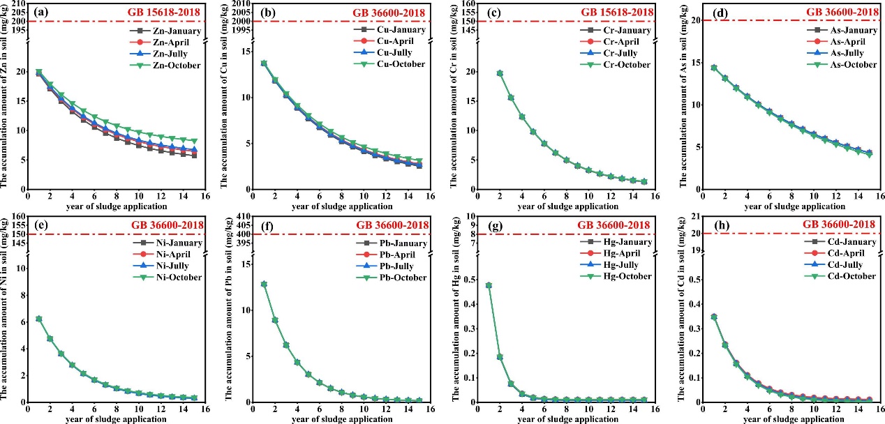 砷、铅、汞、铬、镉等重金属广泛存在于各类环境介质中,对生态环境和人类身体健康造成严重威胁。城市生活污泥作为污水处理的副产物,富集了大量重金属,其行为及去向应重点关注。 “Cambi®热水解+厌氧消化工艺是北京城市生活污泥的主要处理工艺,目前仍缺乏对该工艺过程中重金属的迁移转化规律研究及风险评估,且污水处理厂中污水性质随季节变化,进而影响污泥特性,因此本研究分别于1月、4月、7月、10月沿工艺全流程采样,探讨了该工艺各污泥处理单元(离心脱水、Cambi®热水解、厌氧消化、板框压滤脱水)对重金属的浓度、质量、形态变化的影响,并采用了潜在生态风险指数(RI)和土壤重金属累积预测模型对污泥土地利用时重金属的短、长期风险进行评估。