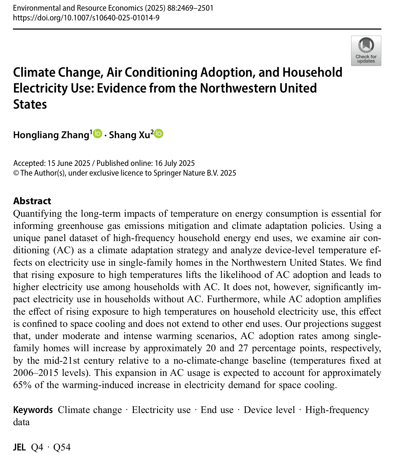 近日,黄色网 张红亮副教授作为第一作者,合作研究论文《Climate Change, Air Conditioning Adoption, and Household Electricity Use: Evidence from the Northwestern United States》发表在资源与环境经济学领域国际知名期刊Environmental and Resource Economics上。