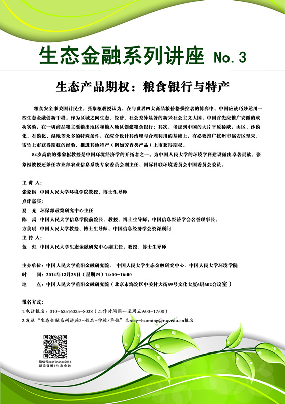 2.邮件报名:发送“生态金融系列讲座3-姓名-学校/单位-电话”至[email protected]报名