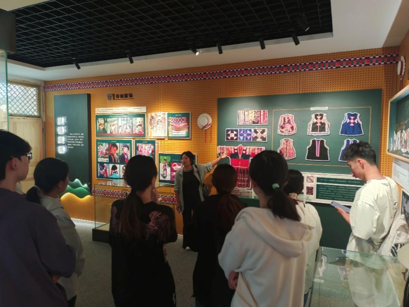 下午,调研团来到文县白马民俗文化博物馆。在工作人员的带领下,调研团的师生深入了解了白马藏族丰富的历史文化和民俗传统。工作人员详细讲述了白马藏族人民的历史渊源和文化习俗。在随后的参观过程中,调研团成员不仅被白马藏族独特的服饰所吸引,比如圆顶,荷叶边并插有白色雄鸡尾羽的沙嘎帽、服饰上独特的星星纹,太阳纹以及24节气纹等等,还见识到了各种各样有趣且热闹的特色活动,例如白马藏族特色舞蹈“池哥昼”。博物馆内,古朴的展品与现代展示技术交相辉映,生动展示了白马藏族在历史长河中的演变与发展。从精美的服饰、独特的宗教信仰到丰富的民间艺术,每一处细节都透露出这个古老民族的独特魅力。