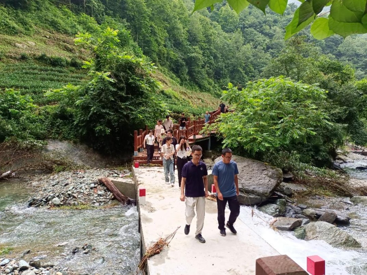 7月19日上午,调研团来到位于碧口镇的大熊猫保护站。碧口镇地处文县东南部,南邻四川青川县,距文县县城81千米,区域总面积208.17平方千米。碧口保护站的主要任务是保护大熊猫、珙桐等多种珍稀濒危野生动植物及其赖以生存的自然生态环境和生物多样性。多年来,碧口保护站在管理局的坚强领导下,认真开展大熊猫及其栖息地保护、巡护监测、森林防灭火、社区共管、大熊猫国家公园建设体制试点等工作,取得了卓越成效。团队成员在这里不仅了解了大熊猫的保护情况,还亲身体验了碧口生态廊道的自然之美,为后续的生态保护工作提供了宝贵的实地资料。碧口镇保护站外建设了碧口生态廊道,拥有原生态的森林和壮丽的瀑布景观,团队成员在此体验了原始大自然之美。