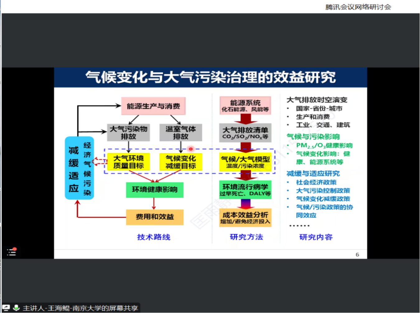 王海鲲教授在气候变化的背景下梳理了全球大气环境问题的现状,并指出我国的“十四五”规划目标、美丽中国和双碳目标都强调了大气污染治理工作。因此,系统评估大气环境政策的成本效益,对于落实我国生态文明建设目标具有重要意义。王海鲲教授特别强调了气候变化与大气污染治理效益研究的基础作用,指出健康效益的研究必须采用多学科交叉理论与方法,对大气排放的时空演变、气候与污染影响、减缓与适应开展研究,并做出综合评价。
