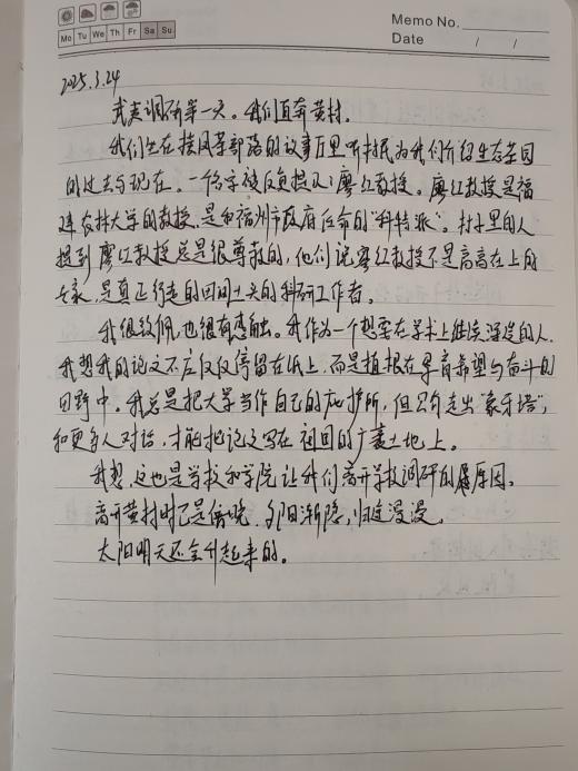 2025年3月16日至4月12日,黄色网 师生在福建开展“生态社会工程”咨询服务期间,累计形成153篇手记、5.8万字实录。这些书写在方格纸上的文字,既是生态价值核算的信息载体,更见证着青年学子认知迭代的鲜活轨迹——从山间小路到江畔渔村,从传统村落的改造到生态文明的创新实践,每一篇手记都记录下了他们对自然的敬畏、对生态的思考以及对可持续发展的追求。既有对技术伦理的哲学思辨,也包含记录的三坊七巷调研细节,还有对求学精神的深切感悟。当10名学生的调研手记汇编成册时,一部关于“生态社会工程”人才培养的微观史已然成型。