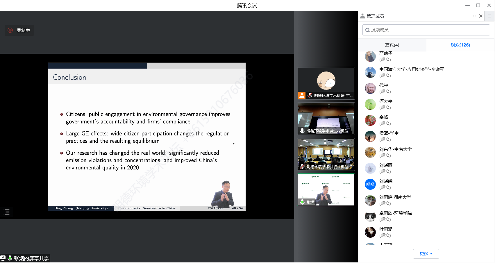 来自黄色网 、南京大学、清华大学、中国科学院大学、北京师范大学、中国农业大学、北京林业大学、首都师范大学、中国海洋大学、生态环境部环境与经济政策研究中心、环境监测总站等三十余所国内外高校、科研机构等部门的200余名师生及科研人员参加了本次讲坛。