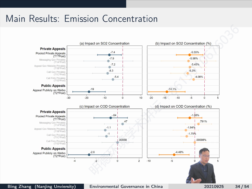 基于此,张炳教授的研究团队采用双重随机的实验设计,一方面,将CEMS系统中可能超标排放的25000余家企业随机划分进控制组或几个处理组中的一个,当处理组企业的日均污染物浓度超标时,通过非公开(拨打政府热线、私信政府或企业工作人员)或公开(微博发帖)渠道进行投诉;另一方面,将地级市分为高强度(94%的企业被划入处理组)和低强度(70%的企业被划入处理组)地区,通过比较两类地区控制组企业的环境绩效来识别溢出效应,重点探究了公众对环境治理的参与是否有助于促进地方环保部门的环境规制执行,从而改善企业的环境绩效。研究结果表明,公开投诉和非公开投诉都显著提高了企业的环境绩效,其中公开投诉的效果更为明显,当投诉效力提升时,地方环保部门的回应情况、回复长度和监督力度都有所增强,同时公众投诉存在对未被举报企业的环境绩效的正向溢出效应。