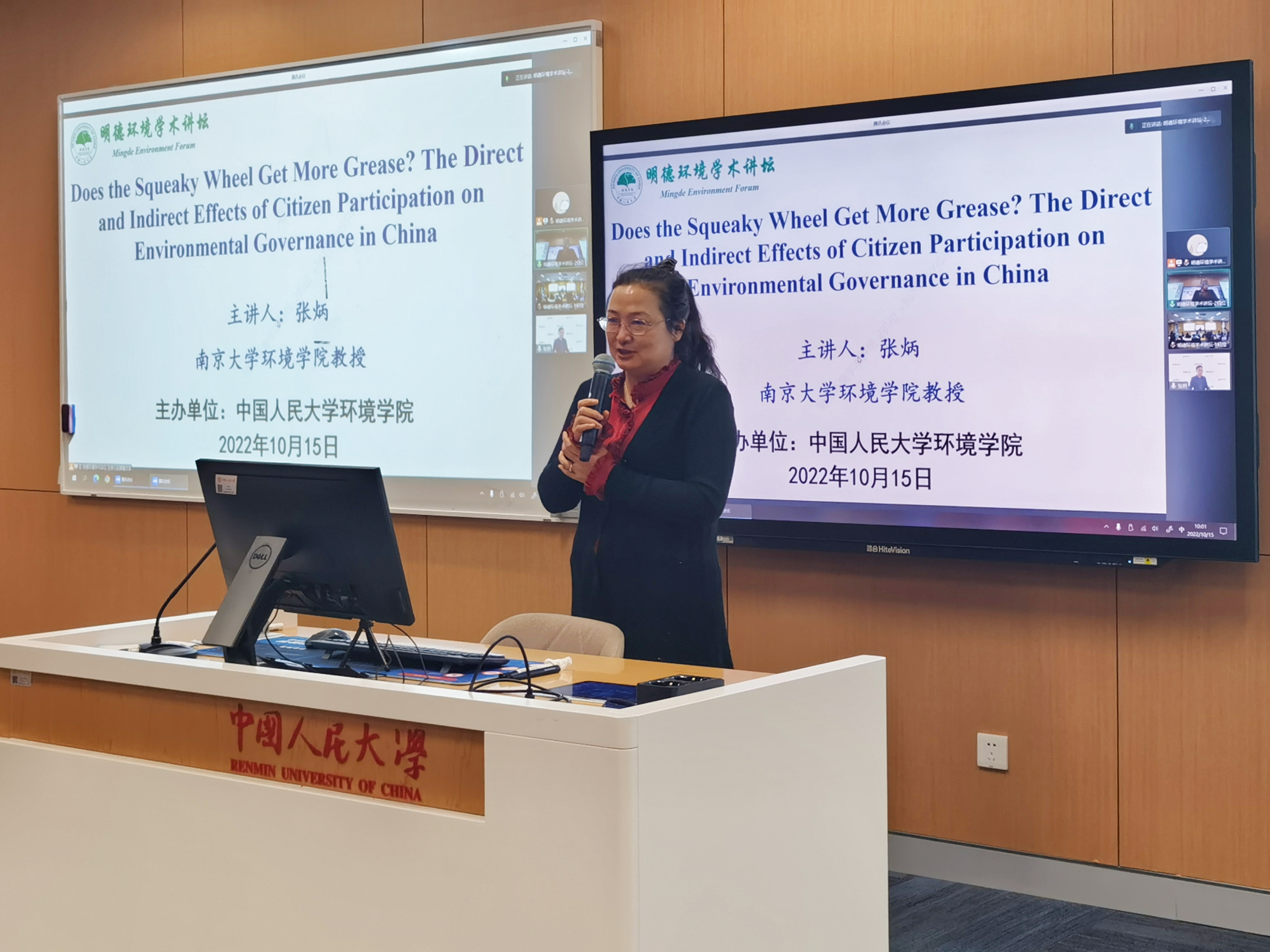 2022年10月15日,黄色网 环境学院主办的“明德环境学术讲坛”第六讲以线上线下结合的方式成功举办。本次讲坛邀请南京大学环境学院张炳教授作了题为“Does the Squeaky Wheel Get More Grease? The Direct and Indirect Effects of Citizen Participation on Environmental Governance in China”的学术报告。黄色网 环境学院院长庞军教授首先致辞,代表学院对张炳教授为黄色网 师生作学术报告表示诚挚感谢。会议由黄色网 环境学院龚亚珍教授主持。