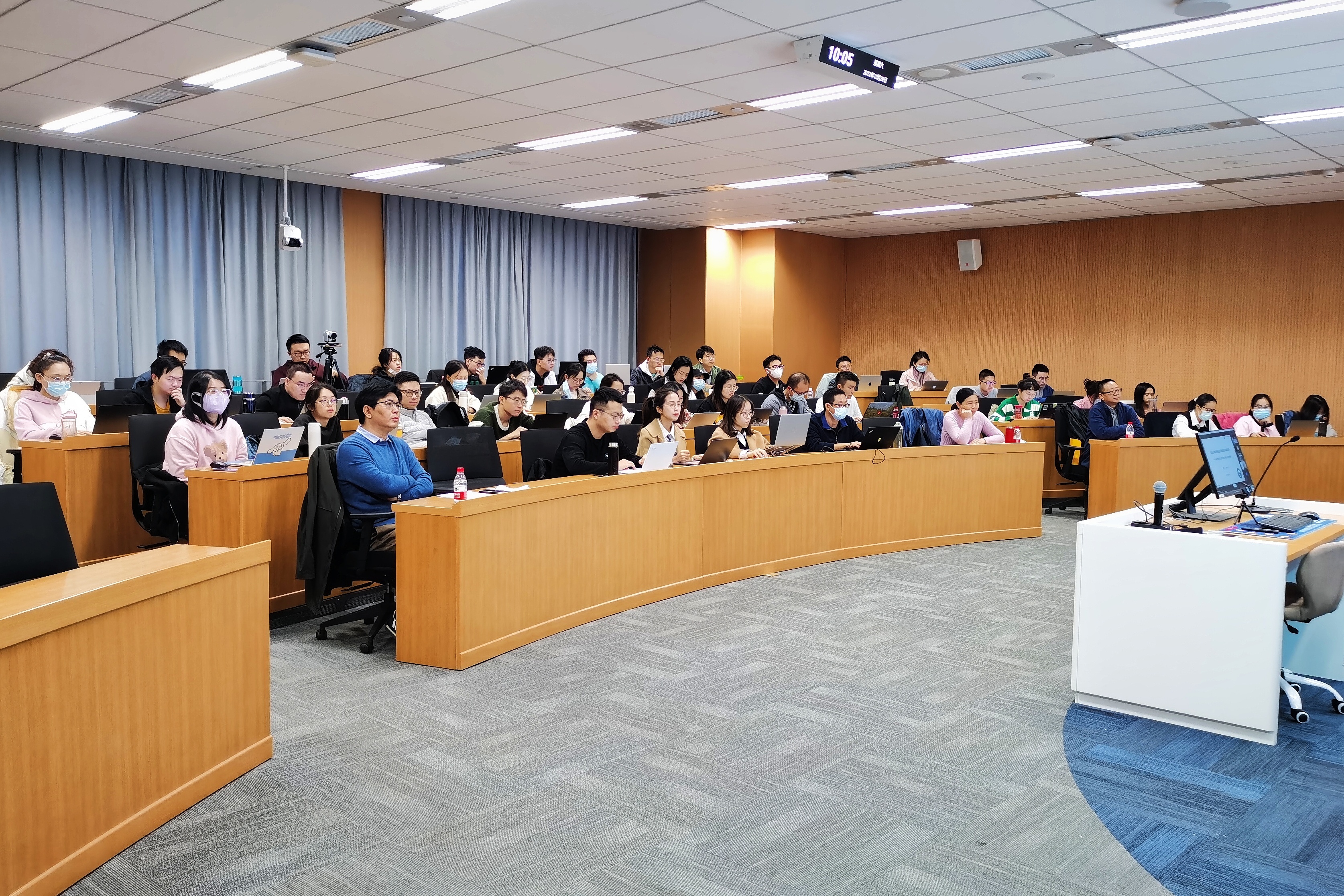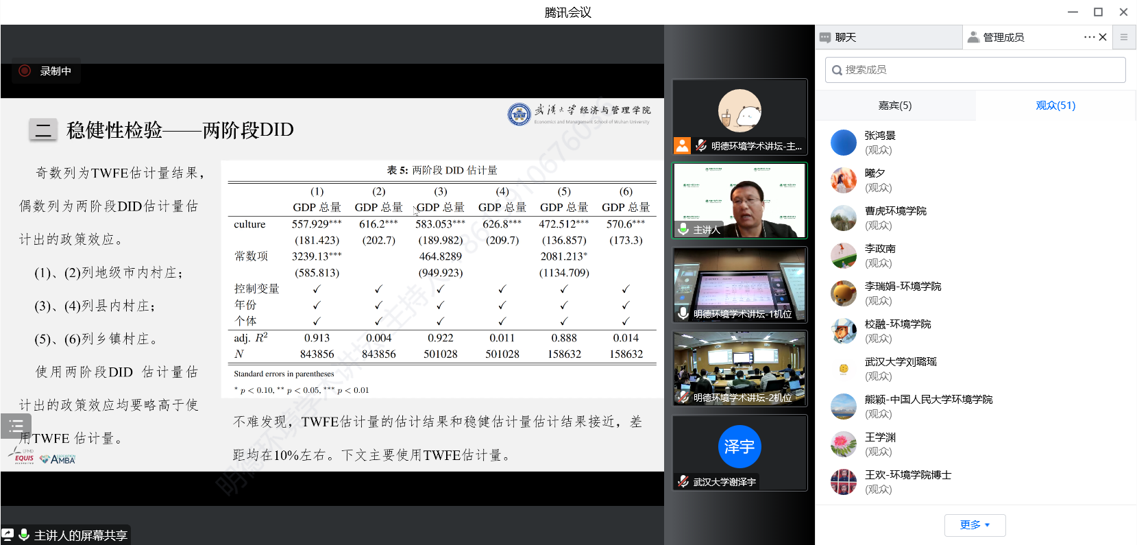 在交流讨论环节,与会师生针对学术报告中关于数据匹配、自选择问题处理、计量回归模型设定、政策的挤出效应和动态效应等问题,与杨冕教授及其研究团队进行了深入探讨,学术氛围热烈。