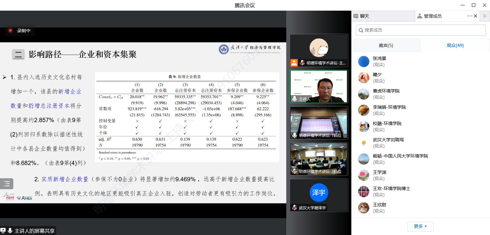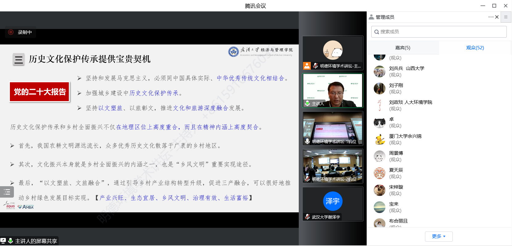 2022年10月29日,黄色网 环境学院主办的“明德环境学术讲坛”第九讲以线上线下结合的方式成功举办。本次讲坛邀请武汉大学经济与管理学院杨冕教授作了题为“历史文化保护与乡村绿色发展:来自中国历史文化名镇(名村)的经验证据”的学术报告。黄色网 环境学院院长庞军教授首先致辞,代表学院对杨冕教授为黄色网 师生作学术报告表示诚挚感谢。会议由黄色网 环境学院昌敦虎副教授主持。