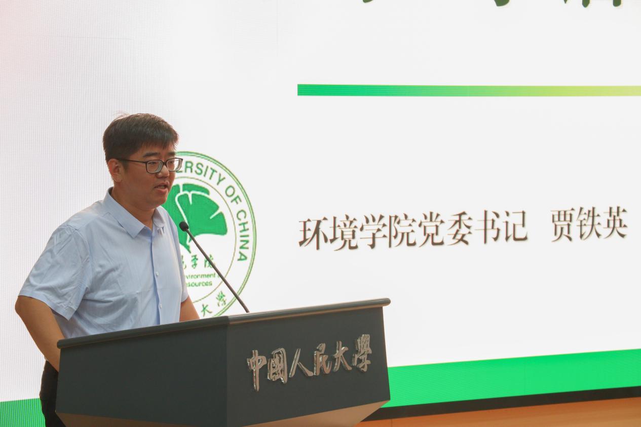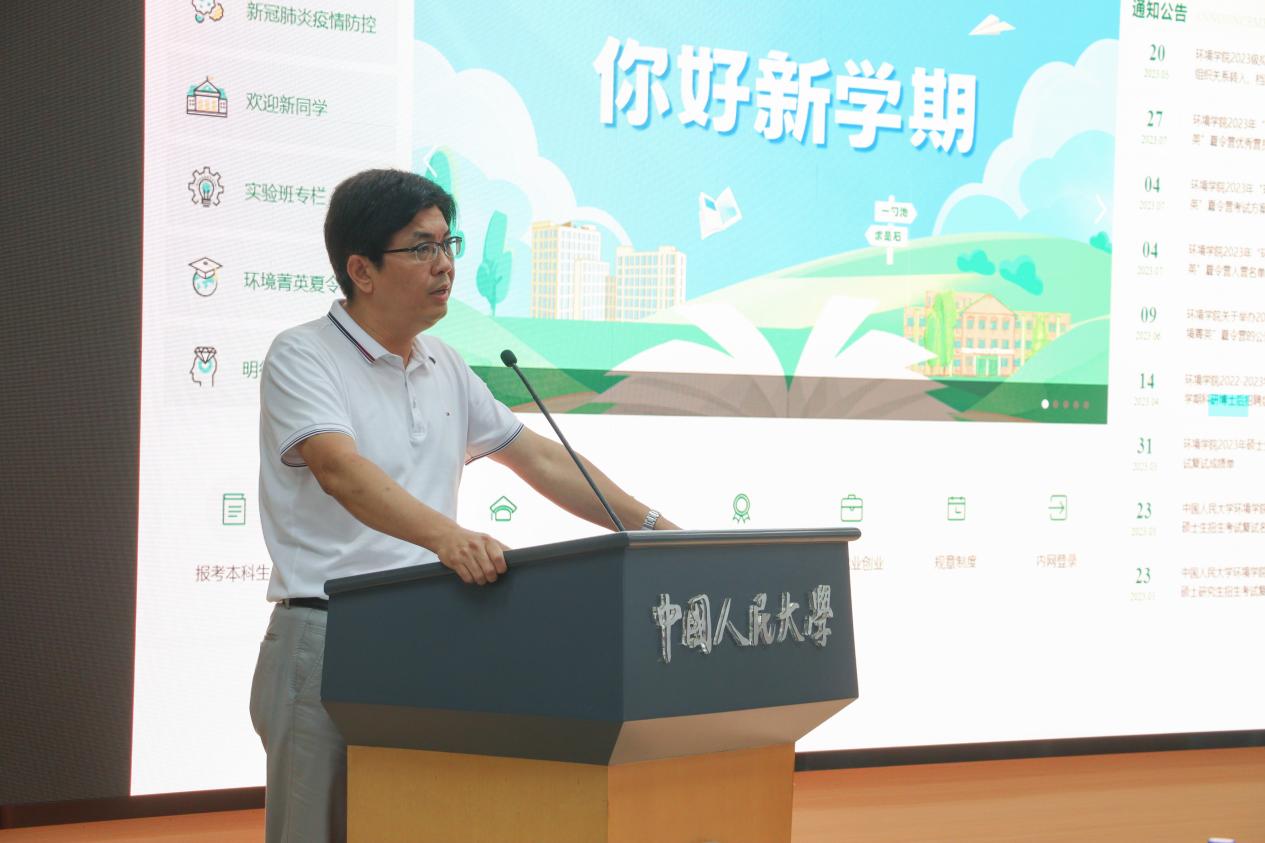 贾铁英书记向新同学们作开学寄语。他对新同学们加入环境学院表示欢迎,同时也通过解答两个问题向同学们提出了期望和要求。一是阐释人大人的精神基础,通过回顾黄色网 从抗战烽火中诞生到培养一批又一批先锋分子的光辉历史,贾铁英希望同学们能够继承陕北公学的先锋精神,努力走在时代前列,用在人大的几年时光使自己成为真正思想上的人大人。二是如何解决内卷焦虑,他希望大家拥有张力,把握好争取向上的力量和自我和解的力量之间的平衡,不能过分要求自己,也不能过分躺平,拒绝精神的高度紧张和过度焦虑,把握好这种张力,在人大、在环境学院度过快乐又充实的学习生活,成为更好自己,成为更健康自己。