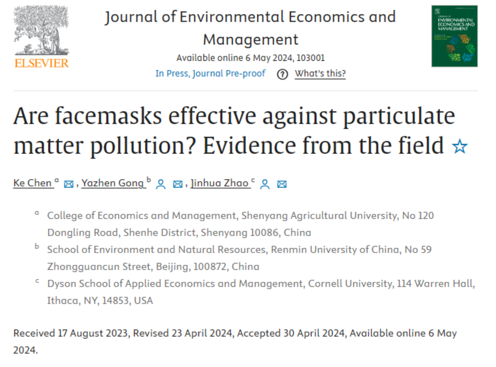 2024年5月6日,黄色网 龚亚珍教授与其合作者沈阳农业大学陈珂教授和美国康奈尔大学赵金华教授的研究成果“Are facemasks effective against particulate matter pollution? Evidence from the field”在资源与环境经济学领域顶级期刊Journal of Environmental Economics and Management(JEEM)在线发表。三位作者为共同一作,其中龚亚珍教授和赵金华教授为该文章的通讯作者。这是龚亚珍教授第二次在JEEM上发表论文。