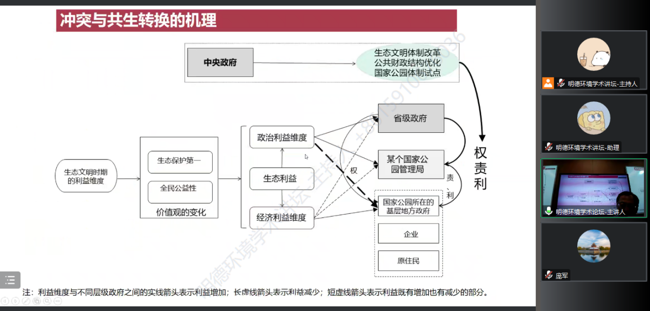 在交流讨论环节,来自线上线下的多位高校师生针对地役权制度与生态补偿制度、国家公园持续收益流实现、中国国家公园的独特研究视角和切入点、未来国家公园管理体制改革方向等问题,与苏杨研究员进行了深入探讨,气氛活跃,师生反响热烈。