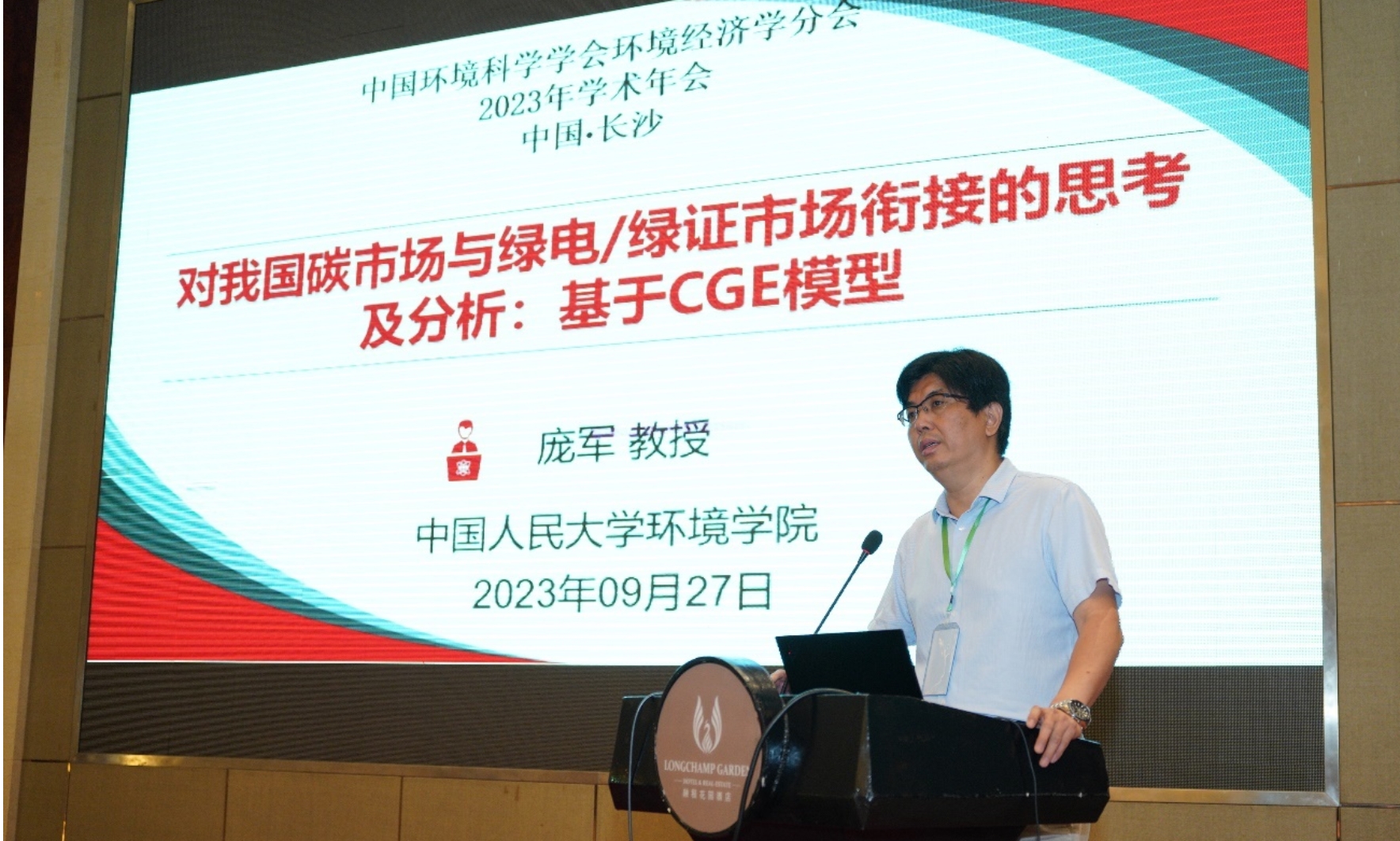 在上午的大会主旨报告环节,环境学院院长庞军教授应邀作题为《对我国碳市场与绿电/绿证市场衔接的思考及分析:基于CGE模型》的学术报告,分析了碳交易-碳税组合碳定价机制、引入CCER交易及抵消机制、碳市场-绿电/绿证交易市场衔接机制的经济影响及减排效果,并基于分析结果指出我国应从三方面促进碳交易与其他市场机制协同发挥作用:一是建立碳交易-碳税组合碳定价机制。在保持宏观税负稳定的前提下,通过企业税负结构的调整推动企业节能减排;适度引入碳配额拍卖机制,逐步减少免费配额发放并扩大配额拍卖比例。二是引入CCER交易及抵消机制。适时重启CCER项目审批与备案工作,从紧设置全国碳配额总量目标。三是建立碳市场-绿证交易市场衔接机制,采取有效措施避免重复计算CCER和绿证减排量。另外,生态环境部环境规划院政策所副所长董战峰研究员、浙江农林大学生态文明研究院院长沈满洪教授、昆山杜克大学张俊杰教授、湖南省环境保护科学研究院环境与经济研究所所长石广明研究员也分别作了主旨发言。