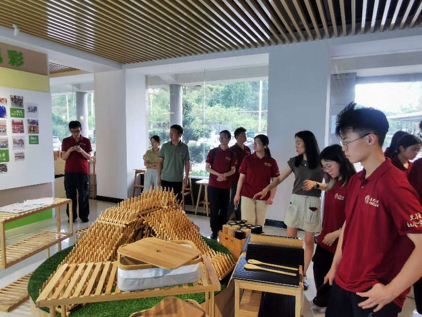 7月10日午,调研团来到邵武市"竹立方"生态科创馆,实地考察当地竹产业在生态产品价值实现方面的探索实践。在工作人员详细介绍下,师生们了解到邵武市依托丰富的毛竹资源,通过技术创新延伸产业链开发出竹板材、竹家具等系列产品,实现了从原材料到终端产品的全链条开发。工作人员详细地讲解了竹材的优点——生长快、韧性高、固碳强、可降解,并介绍当地通过全产业链创新破解行业难题:前端以碳化改色技术提升竹材稳定性,后端开发竹家具、竹纤维快消品等高附加值产品,推动竹产业向家居、建材、时尚领域渗透。工作人员重点介绍了竹材在"以竹代塑"方面的应用前景,展示了竹制餐具、日用品等环保替代产品。邵武市依托国家“以竹代塑”政策支持及出口绿色壁垒优势,通过建立竹产业科创平台,整合研发、设计、生产等环节,推动生态优势转化为经济优势,让“小竹子”串联起低碳经济的大未来。这一实践为生态产品价值实现提供了有益参考。