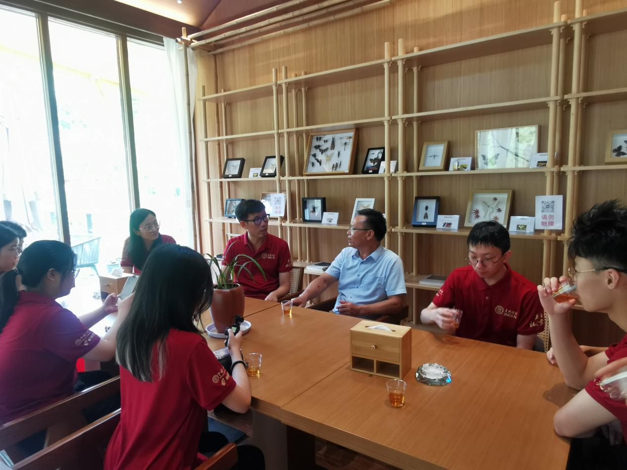 7月9日下午,师生调研团前往桐木村,走访金骏眉发源地骏德茶厂,实地考察生态产品价值实现的创新实践。在茶香氤氲的茶室里,金骏眉首泡制作人梁骏德先生与传承人梁天雄先生向调研团生动讲述了创制金骏眉的传奇历程,"从萎凋、揉捻到炒制、烘干的反复试验与改进,最终成就了这一缕松香",梁骏德先生这段饱含匠心的创业故事让在场师生深刻感受到传统工艺与现代创新的完美融合。梁天雄先生向师生详细介绍了桐木村优质的生态条件,讲述了金骏眉的品牌故事。他指出,"这些天然屏障和独特的气候,造就了茶叶不可复制‘松烟香、桂圆味’这正是武夷山赐予我们最珍贵的生态馈赠。"在品鉴环节,师生们通过琥珀透亮的茶汤、馥郁持久的香气,切身感受到"骏德标准"如何将生态优势转化为品质优势。感悟到:传统工艺的传承需要与时俱进的创新精神;体会到:严格的生态保护不仅成就了茶叶的独特品质,更通过品牌溢价实现了生态价值的市场化转化,这正是'绿水青山就是金山银山'理念的生动诠释。茶厂"古法为基、标准为要、生态为本"的发展模式,为生态产品价值实现提供了可复制的成功范例。