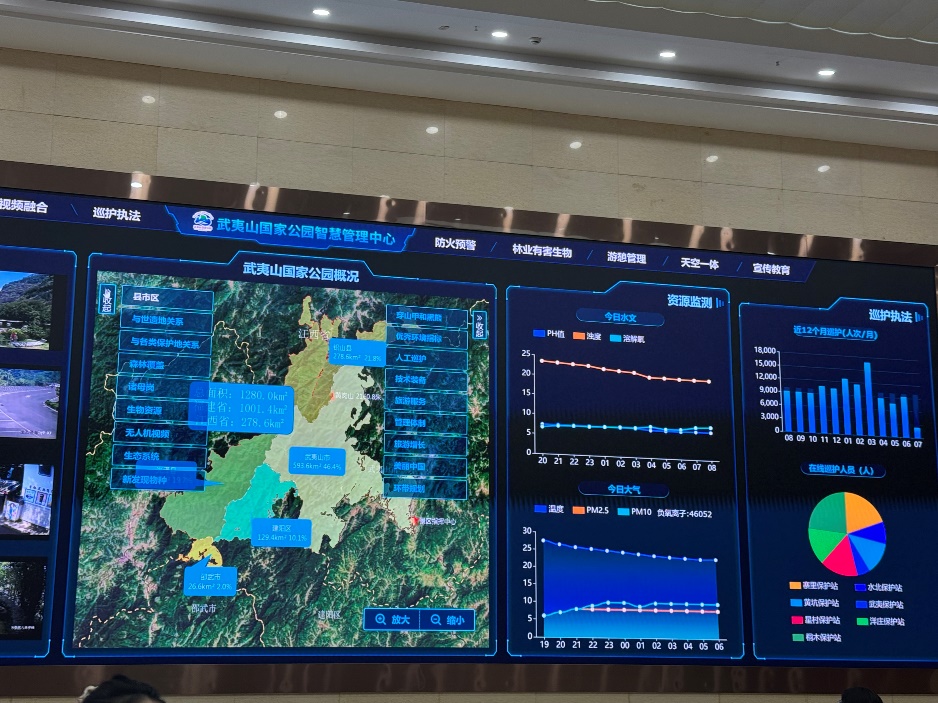 行走于武夷山国家公园及其周边地区的几日,人类智慧与自然生态相交融的震撼始终萦绕在我的心头。调研第二天的上午,站在智慧管理中心大屏前,聆听解说员详细而深入的介绍,一个个流动的数据让我深刻体会到:卫星遥感捕捉的叶脉呼吸、传感器监测的水质脉动,让生态资产从一个抽象的概念转化为可量化的数据甚至是生命特征。人与自然并非割裂的,人类的活动无时无刻不在影响着自然的向上生长。对自然的保护也不仅仅是靠人力巡守,科技的发展终将惠及生态,绿水青山实现的背后离不开人类智慧的结晶。