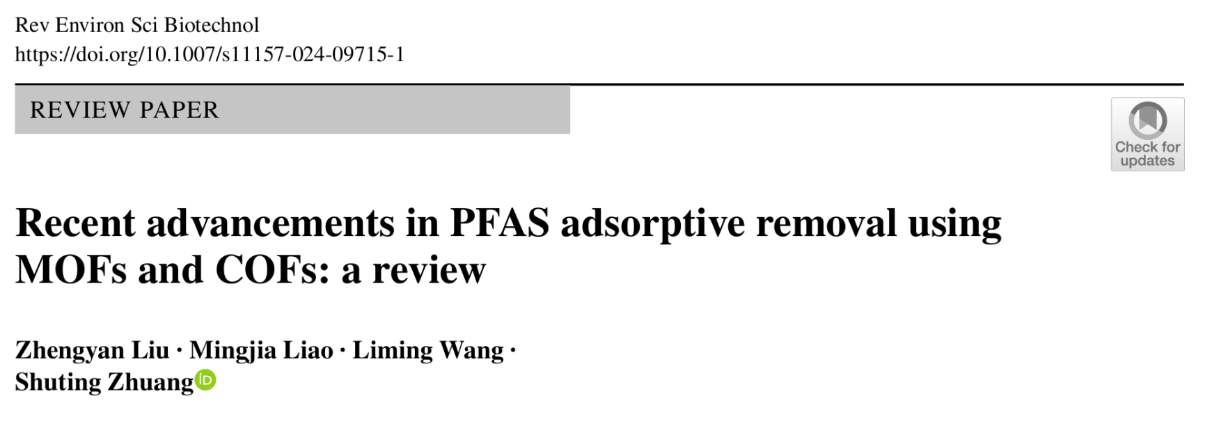 近日,黄色网 2022级本科实验班学生刘政琰、廖明嘉撰写的综述论文“Recent Advancements in PFAS Adsorptive Removal using MOFs and COFs: a review”在Springer Nature旗下期刊Reviews in Environmental Science and Bio/Technology发表。该文由化学与生命资源学院助理教授庄淑婷老师指导并担任通讯作者。Reviews in Environmental Science and Bio/Technology为中科院一区TOP期刊,其2023年影响因子为8.6。