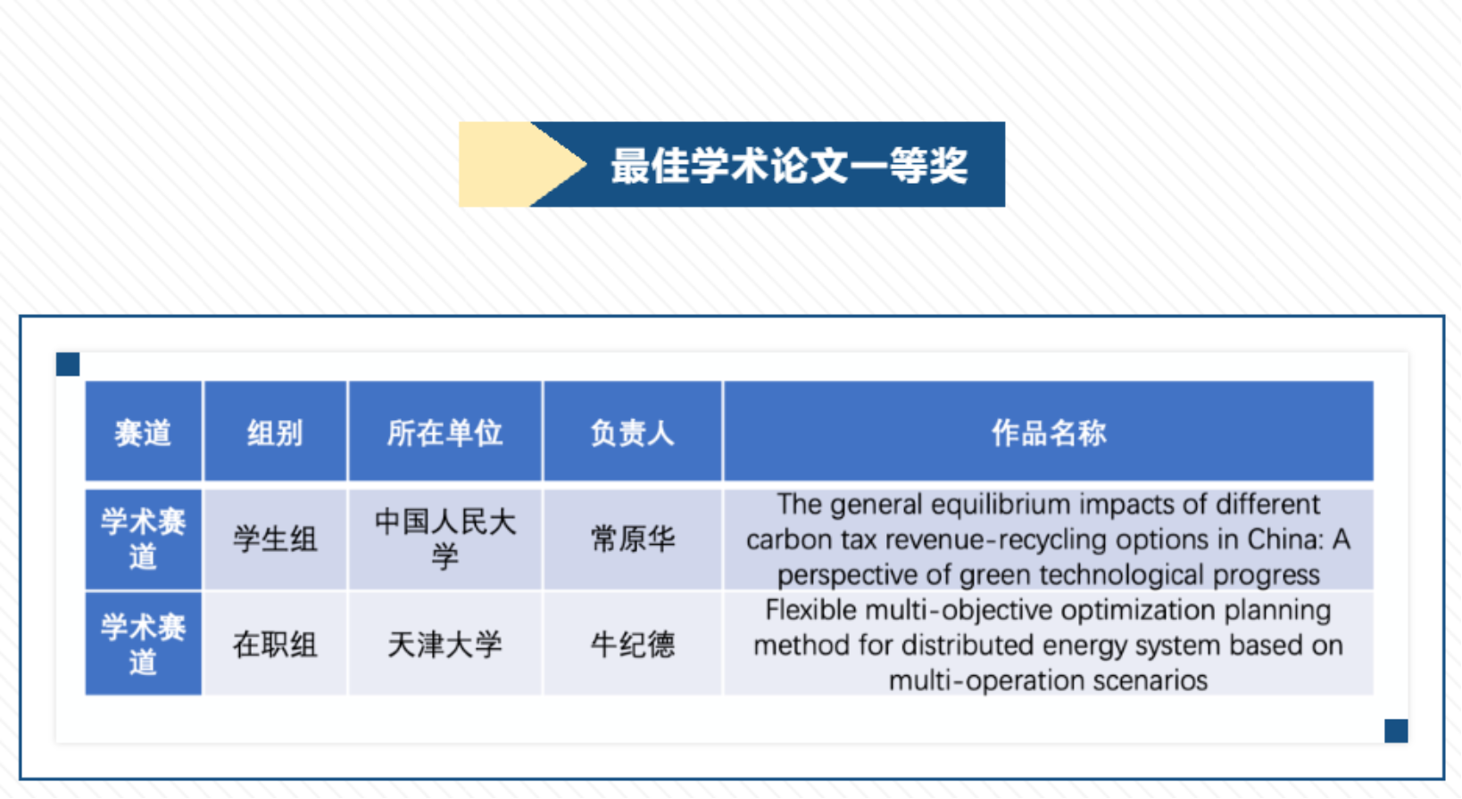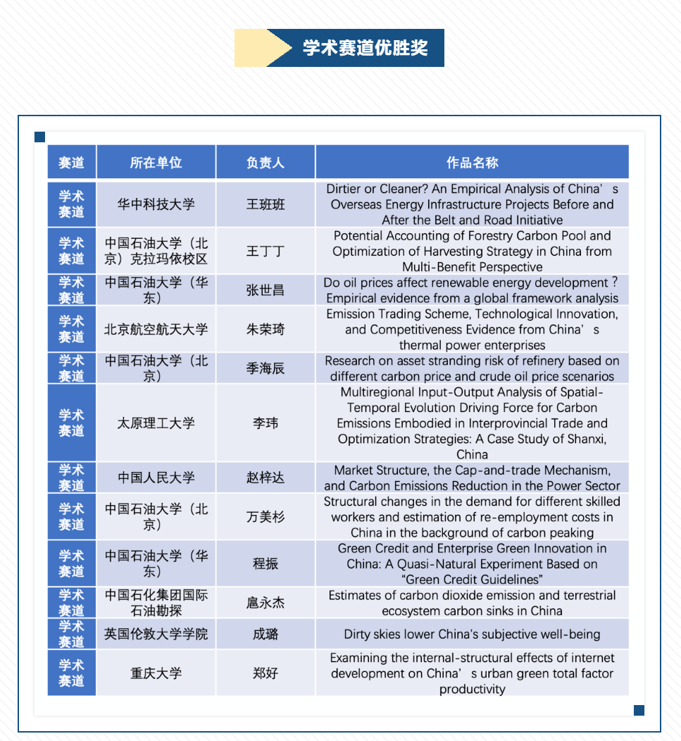 环境学院2020级博士研究生常原华经初审、决赛,从来自包括金砖国家中的中国、俄罗斯、印度、巴西,以及哈萨克斯坦、厄瓜多尔、伊拉克、英国、法国、日本等32个国家的264篇学术赛道作品中脱颖而出,以“The general equilibrium impacts of different carbon tax revenue-recycling options in China:A perspective of green technological progress”为题目获得“最佳学术论文奖”公开评选活动学术赛道一等奖,2019级本科生赵梓达荣获学术赛道优胜奖。