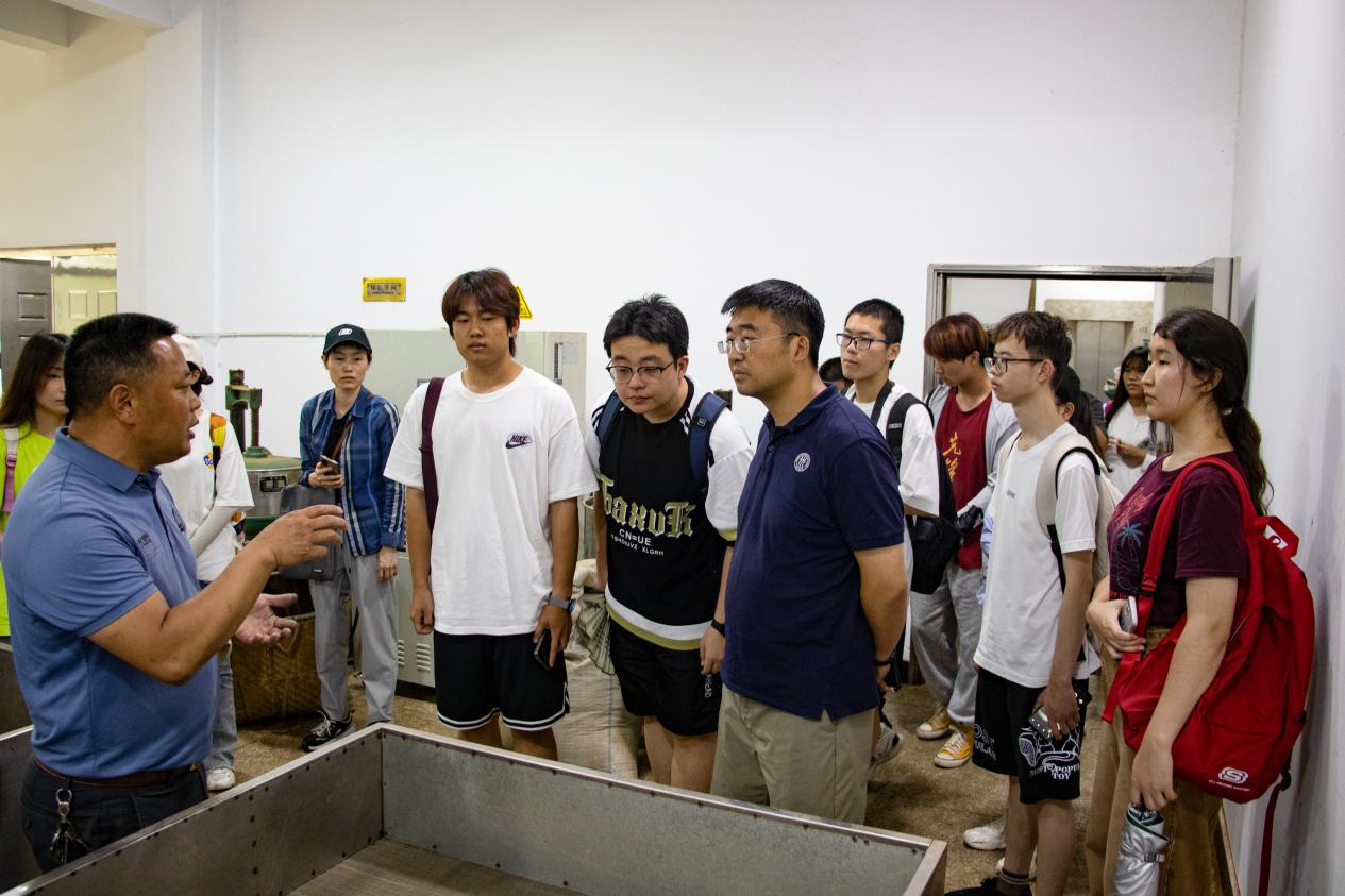 随后,梁添梦带领师生一同考察骏德茶业的生产制作车间,直观感受茶叶逐经萎凋、揉捻、烘培的制作过程。通过考察学习,同学们了解了绿色茶业以绿水青山为滋养、与生态和谐共生的绿色发展实践。正是保证了人与自然的和谐,这片绿水青山才变成了金山银山。
