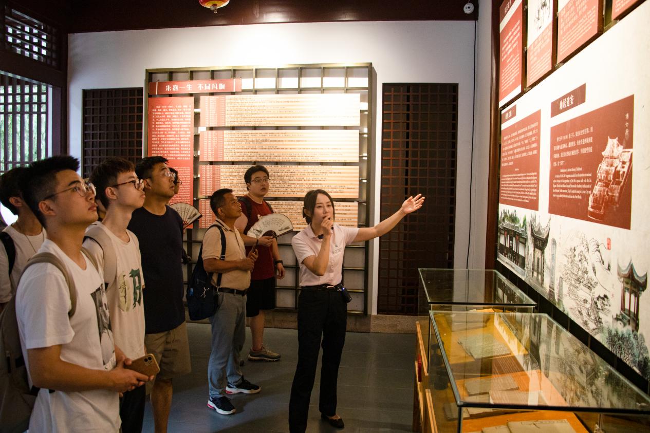 武夷山国家公园是世界人与生物圈保护区,又是世界自然与文化双遗产保护地,朱子理学作为其文化遗产的核心,在新时代里持续更新传承。7月25日上午,调研团队师生来到武夷山朱熹园,展开一场与朱熹同行的文化之旅。在工作人员张芸的讲解中,同学们了解了朱熹的生平经历以及朱子文化的形成与发展,学习感悟朱子学说对儒家思想的传承与创新,以及对当下增强文化自信、复兴民族精神,推进人类命运共同体健康发展的重要意义。