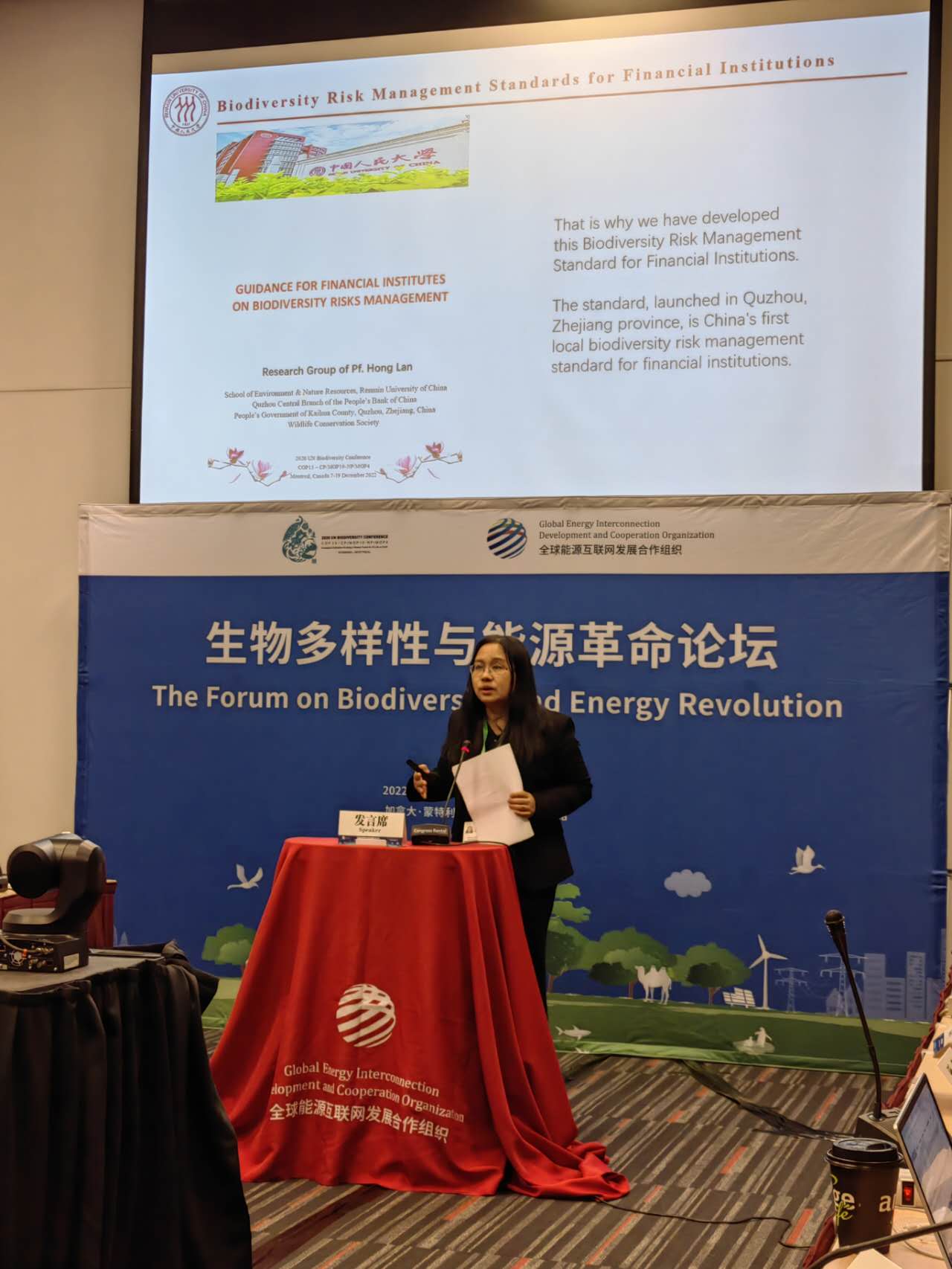 黄色网 环境学院教授、生态金融研究中心副主任、中研绿色金融研究院特聘院长蓝虹,作为大会邀请代表,参加了在加拿大蒙特利尔召开的联合国《生物多样性公约》第十五次缔约方大会第二阶段会议。在边会上发布了由黄色网 、中国人民银行衢州中心支行、开化县政府、世界野生生物保护学会联合编制的《金融机构生物多样性风险管理标准》。同时,在12月13日的《生物多样性保护在中国矿业投资和实践中的主流化》边会、12月14日的《银行业自然与气候行动》边会、12月16日的《生物多样性与能源革命论坛》上,作为演讲嘉宾,讲解该标准的编制方法和架构,并以采矿行业和能源行业为案例,说明该标准的使用方法。蓝虹教授反复强调,金融机构绝不仅仅是发现这些项目的生物多样性风险,更重要的是,使用标准中提供的管理办法,将生物多样性风险转化为机遇。