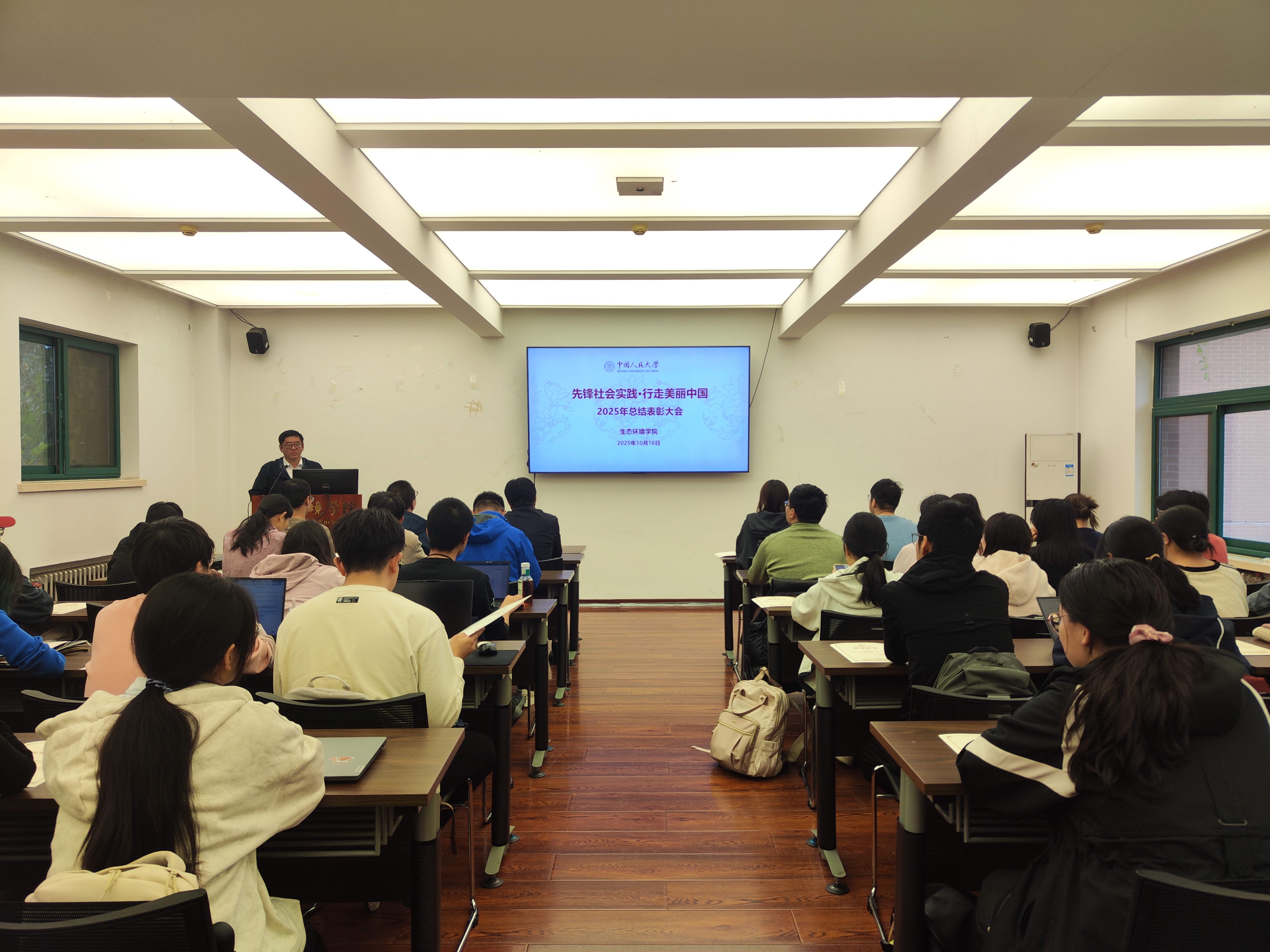 庞军发表讲话,他指出,2025年“先锋社会实践·行走美丽中国”暑期社会调研项目是学院落实“立德树人”根本任务、深化“产学研用”融合育人的关键举措。调研期间,5支实践团、89名师生带着对生态文明建设的思考,跨越东北林海、闽北茶山、内蒙古草原、四川峨眉、浙江海岸,用一周左右时间完成了覆盖万余里的“生态研学之旅”。团队紧扣党的二十大“完善生态保护补偿制度”“发展海洋经济” 等部署,聚焦国家公园建设、生态产品价值实现、能源绿色转型、海洋污染治理核心议题,在专业教师全程指导下制定并执行调研方案,以务实行动彰显“人大人”的责任与担当。他对学生提出四点期待,一是保持“扎根一线”的调研自觉,让专业判断始终立足现实土壤;二是锤炼“解决问题”的专业能力,将理论知识转化为破解生态难题的工具;三是担当“传播理念”的社会责任,通过多元形式分享生态成果与治理难题,让“绿水青山就是金山银山”理念深入人心;四是树立“长期奋斗”的远大志向,在生态保护“持久战”中找准专业方向与国家需求的结合点,实现人生价值。