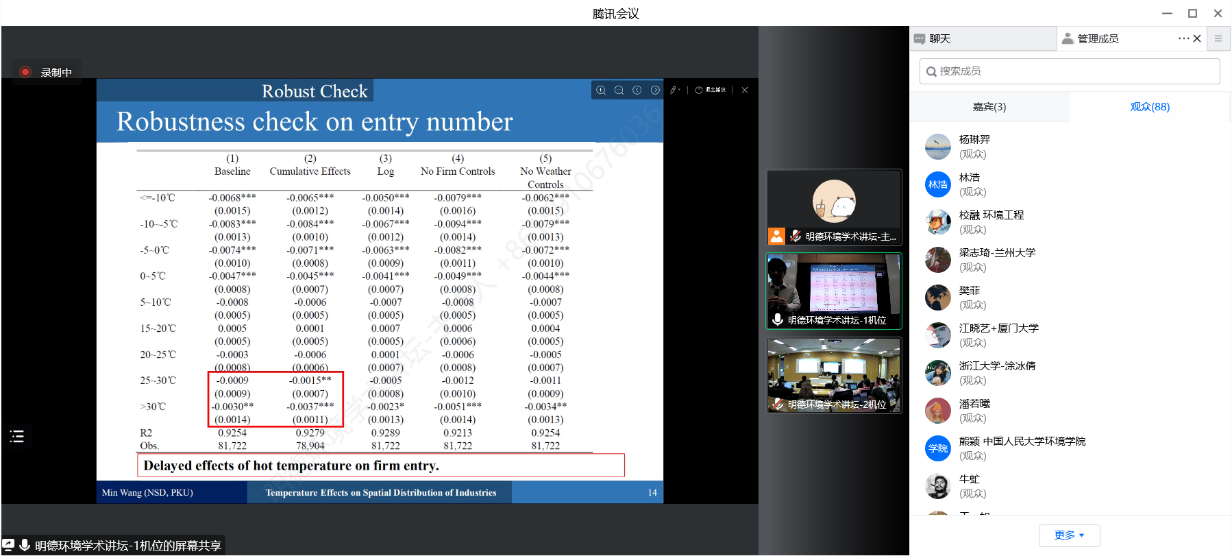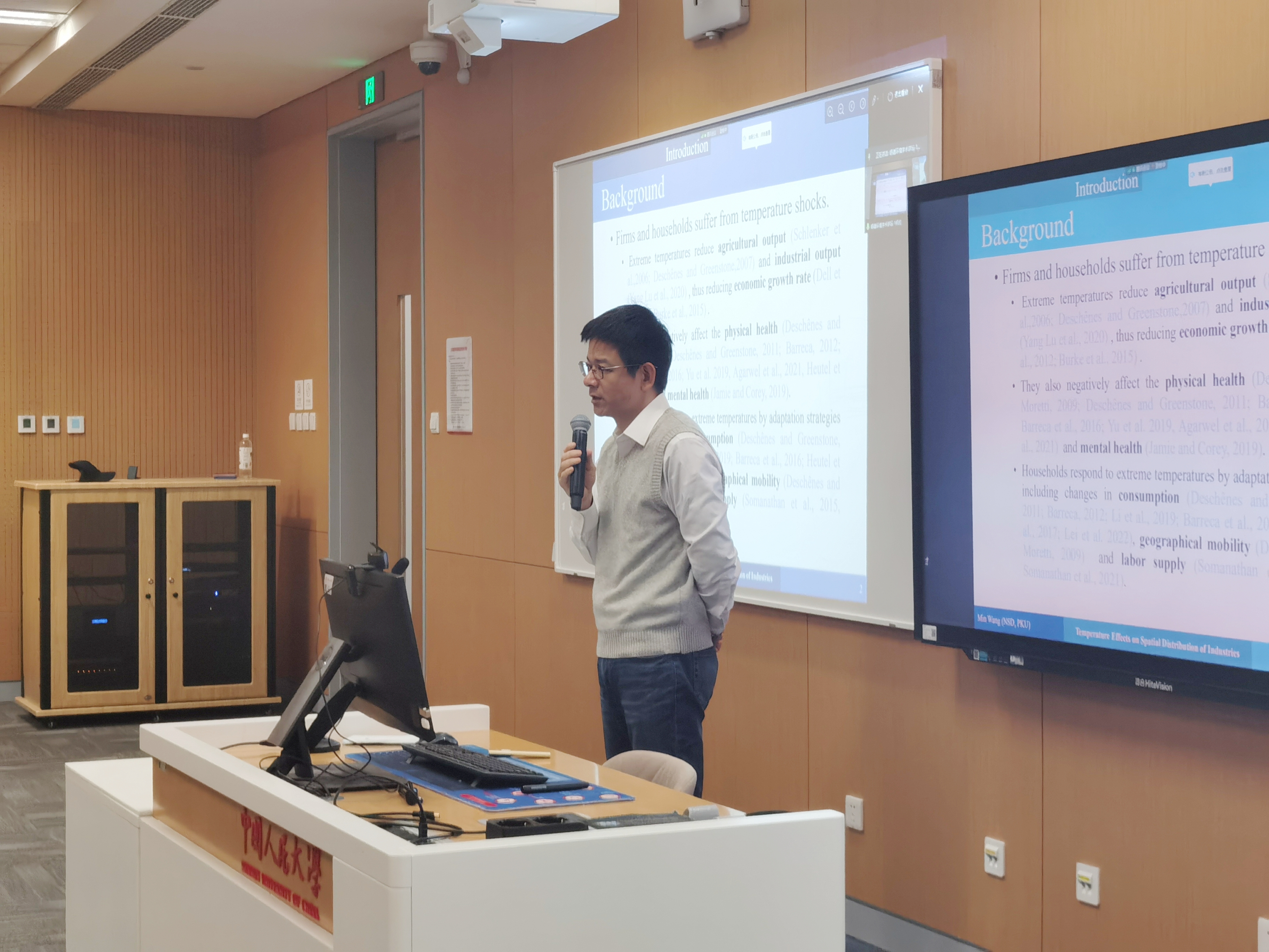 最后,黄色网 环境学院周景博副教授进行了点评。周景博副教授指出,王敏副教授的研究既富有趣味性,又具有深刻的理论和实践意义,该研究能够为理解气候变化对企业进入、退出和跨地区投资的影响提供充分证据,为中国在百年未有之大变局下的未来发展提供启示。同时,周景博副教授还勉励同学们学习王敏副教授对理论的挖掘、数据的剖析和方法的运用,开展科学、规范的学术研究。
