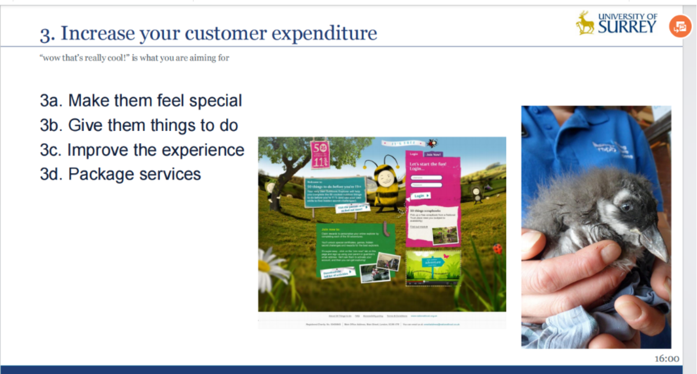 最后,Font教授提出了私营部门实现营销和沟通可持续性的机会。首先,需要改善服务,可以从更好地询问、更值得信赖、更为诚实、更为幽默、更为吸引人等方面入手。其次,需要提高顾客的满意度,包括让他们感觉良好、使用有吸引力的语言、告诉顾客他们做了什么、让顾客的做法更容易、帮助顾客做决定。第三,增加顾客的支出,包括让顾客感觉很特别、给他们事情做、改善体验、打包服务。第四,增加忠诚度,减少季节性,包括让顾客有意识、添加行程日历、给顾客推荐或返回的理由。第五,吸引新顾客,了解顾客的要求。