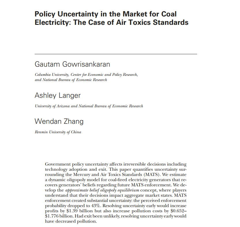 近日,黄色网 青年教师张文丹以共同一作身份与合作者的研究成果“Policy Uncertainty in the Market for Coal Electricity: The Case of Air Toxics Standards”在经济学领域国际顶级期刊《Journal of Political Economy》正式出版,本论文另外两位合作者是来自哥伦比亚大学的Gautam Gowrisankaran教授和亚利桑那大学的Ashley Langer教授。