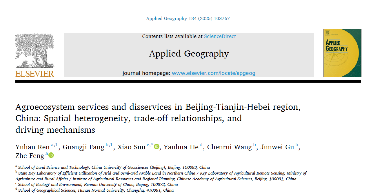 近日,黄色网 孙晓副教授作为唯一通讯作者,与合作者的研究论文“Agroecosystem services and disservices in Beijing-Tianjin-Hebei region, China: Spatial heterogeneity, trade-off relationships, and driving mechanisms”在地球科学研究领域国际知名期刊Applied Geography发表。
